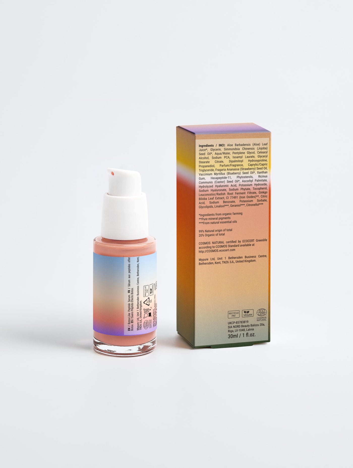 Apply to clean skin. Hydroxyproline (Botox-Like Peptide), Peptide, Phytosterols, Aloe Juice, Sodium PCA, Hyaluronic Acid, Strawberry Seed oil, Blueberry Seed oil, Ginkgo Leaf Extract Aloe Barbadensis (Aloe) Leaf Juice➀, Glycerin, Simmondsia Chinensis (Jojoba) Seed Oil➀, Aqua/Water, Pentylene Glycol, Cetearyl Alcohol, Sodium PCA, Isoamyl Laurate, Glyceryl Stearate Citrate, Dipalmitoyl Hydroxyproline, Propanediol, Parfum/Fragrance, Caprylic/Capric Triglyceride, Fragaria Ananassa (Strawberry) Seed Oil, Vaccinium Myrtillus (Blueberry) Seed Oil➀, Xanthan Gum, Hexapeptide-11, Phytosterols, Ricinus Communis (Castor) Seed Oil➀, Ascorbyl Palmitate, Hydrolyzed Hyaluronic Acid, Potassium Hydroxide, Sodium Hyaluronate, Sodium Phytate, Tocopherol, Leuconostoc/Radish Root Ferment Filtrate, Ginkgo Biloba Leaf Extract, CI 77491 (Iron Oxides)➁, Citric Acid, Sodium Benzoate, Potassium Sorbate, Glycolipids, Linalool➂, Geraniol➂, Citronellol➂